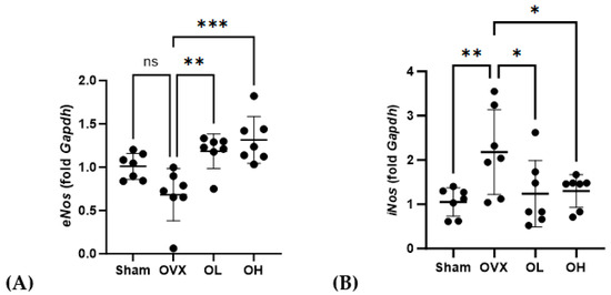 Both aging and menopause increase the risk of cardiovascular diseases [50,51]. Oxidative stress during aging leads to inflammation in the endothelium, resulting in cardiovascular diseases, such as hypertension, stroke, and atherosclerosis [52]. Dyslipidemia, an imbalance in the levels of TG, TC, LDL-c, and HDL-c, is characteristic of aging, and is a cardiovascular risk factor [53,54]. Estrogen plays a protective role against aging-related diseases by regulating lipid metabolism [55], and estrogen deficiency increases postmenopausal dyslipidemia [56]. In the present study, the OVX group showed the highest levels of TG, TC, and LDL-c and the lowest level of HDL-c among all groups, which is in agreement with the lipid profile of menopausal women [57]. OVX-induced changes in the lipid profile were significantly reduced in the OL and OH groups, indicating the beneficial effects of pumpkin seed extract. Moreover, in response to a reduction in the levels of LDL-c and increase in the levels of HDL-c, we detected more favorable values of AI, CRI-I, and CRI-II, which serve as indices of cardiovascular risk. In the vascular system, estradiol mediates eNos activation by binding to estrogen receptors, resulting in NO generation. NO plays a key role in the relaxation of blood vessels; therefore, eNos activity is involved in vasodilation [58,59]. Owing to the decreased estrogen levels during menopause and aging, the levels of eNos and NO decrease, increasing the risk of cardiovascular diseases. The expression of iNos under inflammatory conditions results in the production of large amounts of NO, which can result in atherosclerosis [60,61], and in the present study, we demonstrated that pumpkin seed extract can contribute to protecting the vascular system by upregulating eNos in vasodilation and downregulating iNos under inflammatory conditions. Based on these results, we believe that pumpkin seed extract protects against cardiovascular diseases.