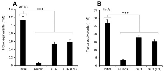 Levels of antioxidant capacity in human semen (Initial) and cryoprotectant (Quinns), as well as in semen diluted with cryoprotectant before (S + Q) and after [S + Q (F/T)] cryopreservation. (A) Using an assay to assess ABTS+● radical cation-scavenging activity, little to no antioxidant activity was found in Quinn’s. As a result, the levels of antioxidant protection provided to the spermatozoa were halved following the dilution of semen 1:1 with Quinn’s and remained unchanged by cryopreservation. (B) Similarly, little antioxidant activity was found in Quinn’s in terms of its ability to scavenge H2O2, resulting in a significant loss of antioxidant protection when it was added 1:1 to semen before and after cryopreservation. *** p < 0.001; n = 15.