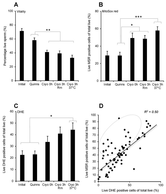 Vitality and ROS generation following cryoprotectant addition (Quinn’s) and immediately post-thaw (Cryo 0 h) as well as after a three-hour incubation at room temperature (Cryo 3 h Rm) or 37 °C (Cryo 3 h 37 °C). (A) Vitality (B) Mitochondrial ROS generation according to MSR. (C) Cellular ROS generation according to DHE. (D) Correlation between the levels of mitochondrial and cellular ROS generation in live cells across the entire dataset (p < 0.001; R2 = 0.5). Some samples were characterised by particularly high mitochondrial ROS generation (circled). * p < 0.05; ** p < 0.01; *** p < 0.001; n = 15.