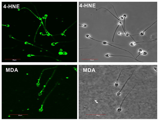 The lipid aldehyde malondialdehyde (MDA) was also quantified to determine the rate of lipid peroxidation in the spermatozoa. Spermatozoa were incubated with LIVE/DEAD™ Fixable Far Red Dead Cell Stain (Molecular Probes, Eugene, OR, USA) at a 1:1000 dilution for 15 min at 37 °C, followed by a single centrifugation and resuspension in BWW. The sample was then incubated with a primary anti-MDA antibody (Abcam) at a 1:100 dilution for 30 min at 37 °C. After the second incubation and subsequent wash, secondary antibody (AlexaFluor-488 goat anti-rabbit IgG, Molecular Probes, Eugene, OR, USA) was added at a 1:100 dilution and incubated at 37 °C for 10 min. The samples were then washed twice by centrifugation and resuspended in BWW. A snap-frozen sperm sample was used as a positive LIVE/DEAD control. Immunocytochemical analysis of the pattern of MDA adduction was also performed using a Zeiss Axio A.2 fluorescence microscope (Carl Zeiss AG, Jena, Germany).