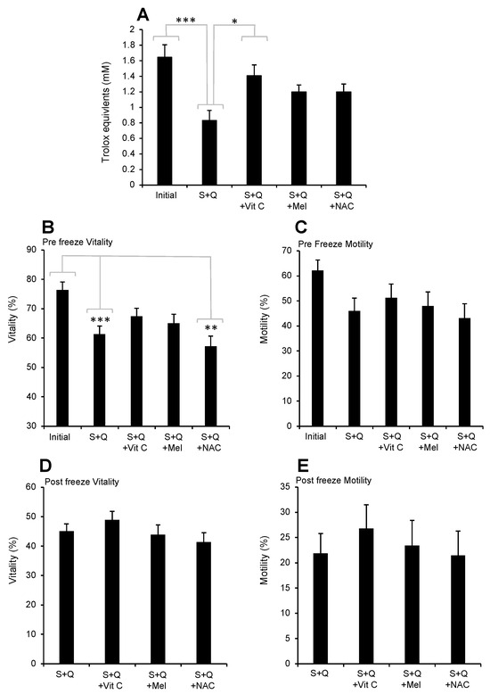 Antioxidant capacity of human semen when Quinn’s cryoprotectant is added 1:1 (S + Q) or supplemented with 0.4 mM vitamin C (S + Q + Vit C), 2 mM melatonin (S+Q + Mel), or 0.2 mM NAC (S + Q + NAC). (A) Free radical scavenging activity measured with the ABTS+● radical-scavenging assay. (B) Vitality of the spermatozoa prior to cryopreservation. (C) Motility of the spermatozoa prior to cryopreservation. (D) Vitality of the spermatozoa following cryopreservation. (E) Motility of the spermatozoa following cryopreservation. * p < 0.05; ** p < 0.01; *** p < 0.001; n = 15.