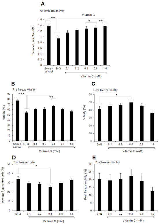 A subsequent analysis demonstrated that the antioxidant impact of vitamin C was clearly dose-dependent (p < 0.001) and resulted in antioxidant activity that was statistically different from the antioxidant activity observed following dilution with Quinn’s alone at doses above 0.4 mM (Figure 9A). Analysis of sperm vitality both before and after cryopreservation subsequently demonstrated that this parameter was significantly improved by the addition of vitamin C at a dose of 0.4 mM (Figure 9B,C), while higher doses were inhibitory. Exactly the same profile was observed in the context of DNA damage, which was significantly improved by the addition of 0.4 mM vitamin C following cryopreservation; however, this effect was lost at higher doses (Figure 9D). A similar trend was also observed for sperm motility, with the highest mean value recorded for spermatozoa incubated with 0.4 mM vitamin C; however, this difference was not statistically significant (Figure 9E), again emphasising the resistance of sperm motility to the ameliorating effects of antioxidant supplementation.