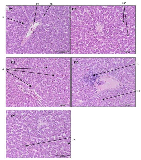 Light microscopic histological appearance of liver tissue obtained from each of group of birds at day 33 of experiment (29 weeks of age) (representative photos with the most clearly visible phenotyping histopathological changes, the same observed in other slides, derived from the same group of birds). H/E staining was used for histological observation. Original magnification ×200. The structure of the liver tissue was examined using graphic analysis software (OlympuscellSens Version 1.5; Olympus, Tokyo, Japan). H—hepatocytes; CV—central vein; HSC—hepatic stellate cells; KC—Kupfer cells; LI—lymphatic infiltration; LV—lipid vacuolization; T0—basal feed; T10—basal feed + 10% raw lupin seeds (Lupinus angustifolius); T15—basal feed + 15% raw lupin seeds (Lupinus angustifolius); T20—basal feed + 20% raw lupin seeds (Lupinus angustifolius); T25—basal feed + 25% raw lupin seeds (Lupinus angustifolius).