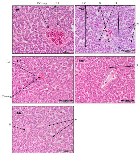 Light microscopic histological appearance of liver tissue obtained from each of group of birds at day 66 of experiment (34 weeks of age) (representative photos with the most clearly visible phenotyping histopathological changes, the same observed in other slides, derived from the same group of birds). H/E staining was used for histological observation. Original magnification ×200. The structure of the liver tissue was examined using graphic analysis software (OlympuscellSens Version 1.5; Olympus, Tokyo, Japan). CV+ cong—central vein with congestion; LI—lymphatic infiltration; LV—lipid vacuolization; N—necrosis; T0—basal feed; T10—basal feed + 10% raw lupin seeds (Lupinus angustifolius); T15—basal feed + 15% raw lupin seeds (Lupinus angustifolius); T20—basal feed + 20% raw lupin seeds (Lupinus angustifolius); T25—basal feed + 25% raw lupin seeds (Lupinus angustifolius).