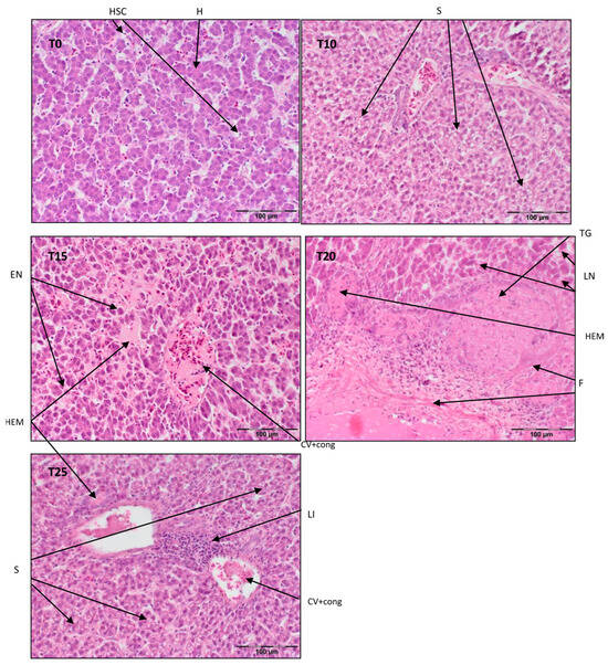 Referring to Figure 3, the liver parenchyma has a normal structure in T0 with some degeneration of ballooning cells. In T10, there is mild steatosis with vein congestion and periportal necrosis. T15 exhibits congestion of the central vein and sinusoids with centrilobular necrosis. Included in Figure 3, T20 shows complete disintegration of the normal parenchyma structure, probably due to tumorigenesis, with necrosis and fibrosis and signs of an inflammatory reaction. T25 displays centrilobular steatosis with lymphatic inflammation and an obliterated hepatic parenchyma structure. T15, T20, and T25 also exhibit extensive hemorrhaging, which is mostly presented in several areas near larger blood vessels (T15, T25).
