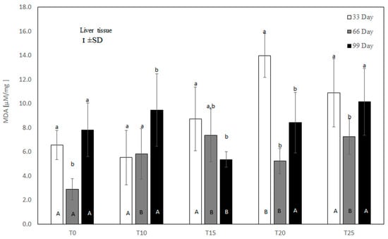 One-way ANOVA and Tukey tests (p < 0.05) for MDA concentration in the liver of hens at day 33 of experiment (29 weeks of age), day 66 of experiment (34 weeks of age), and day 99 of experiment (39 weeks of age). The same letter designations indicate no statistically significant differences. Upper-case letters were used to show statistically significant results (p ≤ 0.05) between groups, and lower-case letters indicate differences within the group on the three study dates. T0—basal feed; T10—basal feed + 10% raw lupin seeds (Lupinus angustifolius); T15—basal feed + 15% raw lupin seeds (Lupinus angustifolius); T20—basal feed + 20% raw lupin seeds (Lupinus angustifolius); T25—basal feed + 25% raw lupin seeds (Lupinus angustifolius). ±SD—standard deviation.