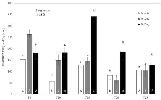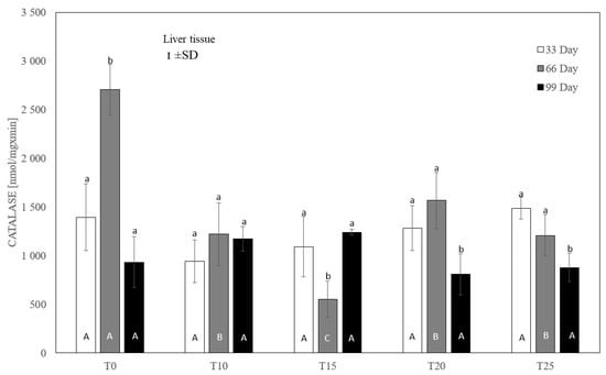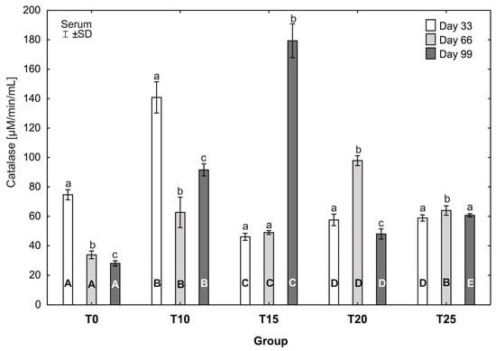 In groups T0, T10, and T20, statistically significant differences in the average catalase activity were observed between all sampling days. In group T0, the average catalase activity was statistically significantly higher (p ≤ 0.05) at the 33rd day of the study (74.69 ± 3.14) than at 66 (33.84 ± 2.42) and 99 days (28.07 ± 1.64). Similarly, the average catalase activity in group T10 was statistically significantly higher (p ≤ 0.05) at the 33rd day of the study (140.85 ±9.68) than at 66 (62.72 ± 9.47) and 99 (91.56 ± 3.77) days. In group T10, the average catalase activity increased statistically significantly at the 99th day of the experiment compared to its activity at 66 days. Statistically significantly higher (p ≤ 0.05) catalase activity in group T20 was observed at the 66th day of the study (97.89 ± 3.10) compared to the other days. The highest catalase activity in the experiment was observed at the 99th day of the study in group T15 (179.38 ± 10.53). This value was also statistically significantly higher (p ≤ 0.05) than the activity of this enzyme in this group at 33 and 66 days. The most balanced catalase activity was observed in group T25; however, at the 66th day of the study, the average catalase activity was statistically significantly higher (p ≤ 0.05) than at 33 and 99 days. At the 33rd day of the study, the average catalase activity varied greatly between groups. The average catalase activity in group T10 on that day (140.85 ± 9.68) was statistically significantly higher (p ≤ 0.05) than in the other groups. After 66 days, the average catalase activity in group T0 differed statistically significantly from the other groups. At the 99th day of the study, statistically significant differences in average catalase activity were observed between all groups, with the highest activity observed in group T15 (179.38 ± 10.53b) (Figure 8).