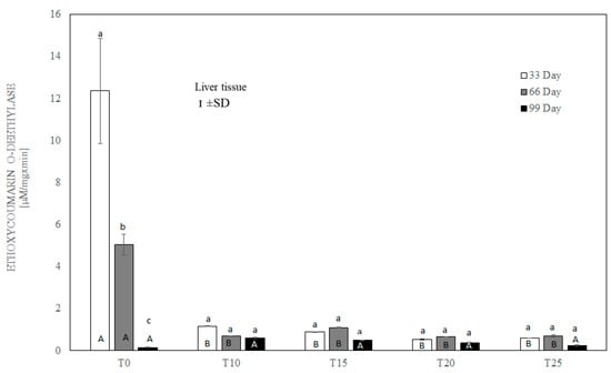 One-way ANOVA and Tukey tests (p < 0.05) for ethoxycoumarin O-deethylase (ECOD) activity in the liver of hens at day 33 of experiment (29 weeks of age), day 66 of experiment (34 weeks of age) and day 99 of experiment (39 weeks of age). The same letter designations indicate no statistically significant differences. Upper-case letters were used to show statistically significant results (p ≤ 0.05) between groups, and lower-case letters indicate differences within the group on the three study dates. T0—basal feed; T10—basal feed + 10% raw lupin seeds (Lupinus angustifolius); T15—basal feed + 15% raw lupin seeds (Lupinus angustifolius); T20—basal feed + 20% raw lupin seeds (Lupinus angustifolius); T25—basal feed + 25% raw lupin seeds (Lupinus angustifolius). ±SD—standard deviation.