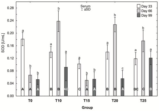 The average superoxide dismutase (SOD) activity in group T0 was statistically significantly higher (p ≤ 0.05) (0.19 ± 0.02) after day 33 of the study than after 66 and 99 days. In groups T10, T20, and T25, statistically significantly higher (p ≤ 0.05) average SOD activity was observed at day 66 of the experiment, compared to the other days (day 33 and 99). Moreover, in groups T10 and T25, SOD activity levels at days 33 and 99 did not differ statistically significantly. However, the average SOD activity in group T20 after 99 days (0.06 ±0.03) was statistically significantly lower (p ≤ 0.05) than on the other days of the study. The lowest average SOD activity at day 33 of the study was observed in group T15, and was statistically significantly higher (p ≤ 0.05) than on the remaining days (66 and 99). At day 33 of the study, SOD activity was highest in group T0 (0.19 ± 0.02), and this value was statistically significantly different from that observed in the other experimental groups. SOD activity at 33 days was statistically significantly lower (p ≤ 0.05) in group T15 than in groups T10 and T20. At 66 days, the average SOD activity was statistically significantly higher (p ≤ 0.05) in groups T10 and T20 than in groups T15, T25, and T0. After 99 days of the experiment, the average SOD activity in groups T15 and T20 differed statistically significantly from the activity in group T25, in which the highest SOD activity was recorded (0.13 ± 0.02), (Figure 9).