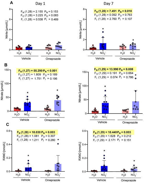 Changes in the concentrations of nitrite, nitrate, and RXNO measured in plasma samples on day 1 and on day 7 of treatment with sodium nitrite (15 mg/kg) or water via gavage in both vehicle- or omeprazole (10 mg/kg)-treated rats. Blood samples were collected precisely 6 h after the last dose of oral nitrite. (A–C) display the concentrations of nitrite, nitrate, and RXNO, respectively. Data presented as mean ± S.D. (n = 7–9/group). The values of F correspond to the F-statistics for each factor (FN for nitrite factor, FO for omeprazole factor, and FI for the interaction between factors). * p < 0.05 versus respective H2O group.