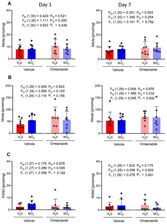 Additionally, the RXNO concentrations on the 7th day of treatment in the NO2− vehicle group had an average of 0.33 pmol/mg compared to 0.11 pmol/mg in the H2O vehicle group. The concentrations in the omeprazole NO2− group exhibited an average of 0.20 pmol/mg vs. 0.19 pmol/mg in the omeprazole H2O group (Figure 4C).