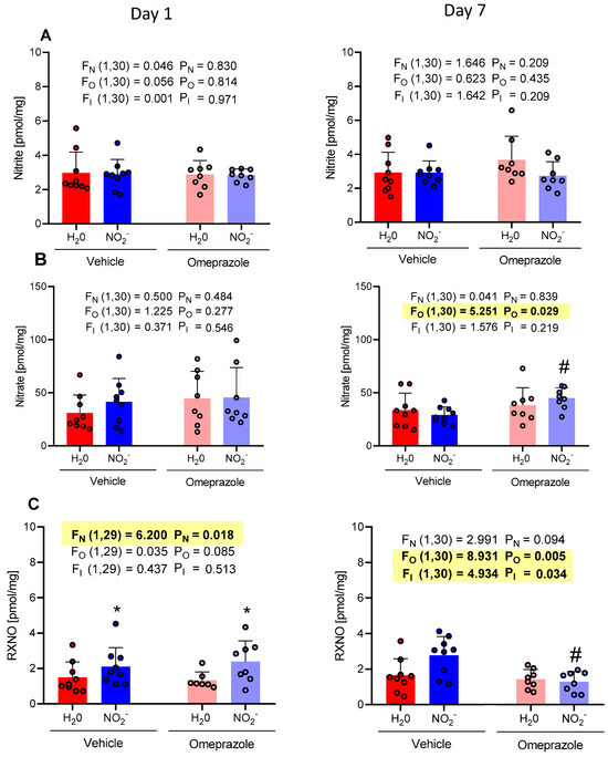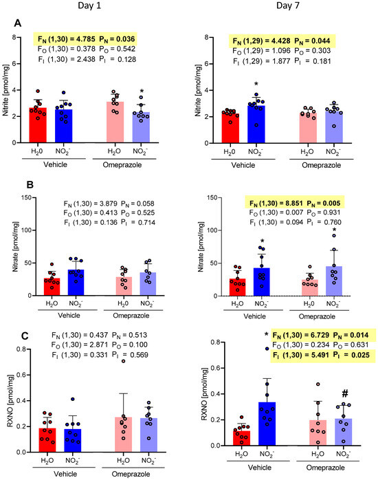 Changes in the concentrations of nitrite, nitrate, and RXNO measured in the heart on day 1 and on day 7 of treatment with sodium nitrite (15 mg/kg) or water via gavage in both vehicle- or omeprazole (10 mg/kg)-treated rats. Blood samples were collected precisely 6 h after the last dose of oral nitrite. (A–C) display the concentrations of nitrite, nitrate, and RXNO, respectively. Data presented as mean ± S.D. (n = 7–9/group). The values of F correspond to the F-statistics for each factor (FN for nitrite factor, FO for omeprazole factor, and FI for the interaction between factors). * p < 0.05 versus respective H2O group. # p < 0.05 versus vehicle NO2− group.