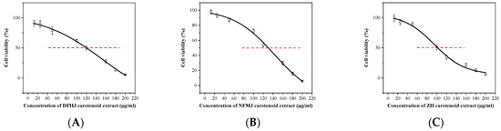Referring to Wen Xia et al.’s method [2], the MDA-MB-231 cells were cultured at the exponential proliferation phase and seeded at 1 × 104 cells per well into 96-well plates. The cells were incubated at 37 °C in a 5% CO2 incubator. After 24 h of incubation, the medium was replaced with fresh medium with different carotenoid extract concentrations (12.5~200 µg/mL) for the treatments and fresh medium with 0.5% DMSO for the control. The cells were incubated with the carotenoid extracts for 48 h, after which the existing medium was discarded, and the cells were washed with PBS. Then, the cytotoxicity was determined using CCK8 kits, and the percentage of cell loss under control and different treatments was calculated. We used the software OriginPro 2021 to fit the absorbance value measured at 450 nm to obtain the fitting curve and the IC50. Experiments were performed three times.