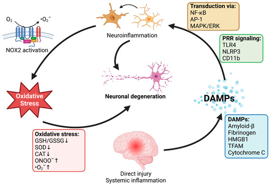 Interplay between neuroinflammation and oxidative stress in neurodegeneration. Direct injury to the neuronal tissue or systemic inflammatory response trigger the activation of damage-associated molecular patterns (DAMPs—such as amyloid-beta, fibrinogen, high mobility group box 1 (HMGB1) protein, mitochondrial transcription factor A (TFAM) and cytochrome c). DAMPs signal activation of microglia (resident macrophages) through pattern recognition receptors (PRRs), such as complement receptor 3 (CD11b), Toll-like receptor 4 (TLR4), and NLR family pyrin domain containing 3 (NLRP3) inflammasome. These signals are transduced in microglia by nuclear factor κB (NF-κB), activator protein 1 (AP-1), and mitogen-activated protein kinases (MAPKs)/extracellular signal-regulated kinase (ERK). Activated microglia produce superoxide (•O2−) through NADPH oxidase (NOX-2), promoting oxidative stress. Oxidative stress can be based on lower antioxidant defense (reduced/oxidised glutathione—GHS/GSSG; superoxide dismutase—SOD; catalase—CAT), and an increase in reactive oxygen and nitrogen species (peroxynitrite—ONOO− and •O2−) formation. Both neuroinflammation and oxidative stress have a detrimental effect on neuronal tissue, causing neuronal death and promoting neurodegeneration. Adapted from [66] under Creative Common CC BY license. Created with BioRender.com.
