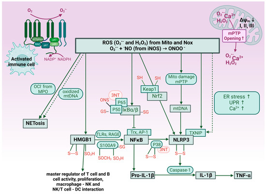 Overview on redox-dependent exacerbation of inflammatory processes and pathways. Primary sources of superoxide are the phagocytic NADPH oxidase in activated immune cells and damaged mitochondria. Superoxide either dismutates to hydrogen peroxide or reacts with nitric oxide from iNOS to form peroxynitrite (ONOO−). These ROS can cause redox modifications in master regulators of inflammation such as HMGB1, NF-κB, and NLRP3 or of central inflammatory processes such as NETosis. Also upstream regulators of these processes are redox-regulated. The red-groups indicate redox modifications. S—S, disulfide bridge; SO3H, sulfonic acid; SOCH3, oxidized methionine; SG, S-glutathionylation; 3NT, 3-nitrotyrosine; SNO, S-nitrosothiol; SH, reduced thiol. Other abbreviations are as follows: ER, endoplasmic reticulum; UPR, unfolded protein response; mPTP, mitochondrial permeability transition pore; mtDNA, mitochondrial DNA; Trx, thioredoxin; AP-1, activator protein 1 transcription factor; IkB, nuclear factor of kappa light polypeptide gene enhancer in B-cells inhibitor; TLR, Toll-like receptor; RAGE, receptor for advanced glycation end products; OCl−, hypochlorite; MPO, myeloperoxidase; Keap1, Kelch-like ECH-associated protein 1; Nrf2, nuclear factor erythroid 2-related factor 2; Casp-1, caspase 1; Nox, NADPH oxidase. Scheme was generated from data reported in [65,158]. Created with BioRender.com.