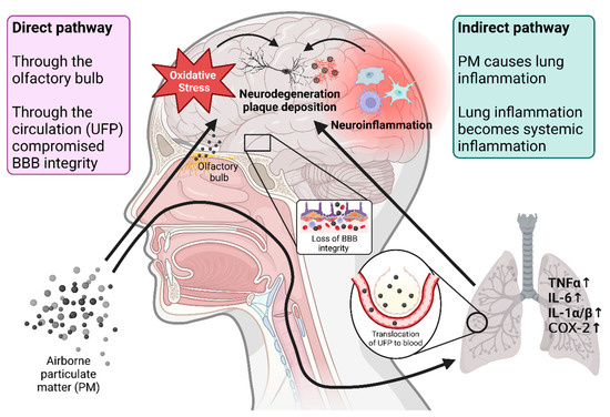 Mechanisms of air pollution-induced neuroinflammation and oxidative stress. Air pollution can cause neuroinflammation and oxidative stress through two pathways: direct and indirect. Air pollution components directly interact with the neuronal tissue in the direct pathway. This can happen by direct contact of air pollution components, such as particulate matter (PM), with the nerves in the olfactory bulb, helping them translocate deeper into the neuronal tissue. Another way is for ultrafine particles (UFP) with a diameter in the nanometer range to enter the systemic circulation after inhalation, causing disturbance of the blood–brain barrier (BBB) and reaching the cerebral tissue. The indirect pathway starts by initiating local inflammation in the lung, the first point of impact for inhaled air pollution components, which then gains systemic character. This systemic inflammation, in the form of circulating cytokines and pro-inflammatory mediators (such as tumor necrosis factor-alpha—TNFα; interleukins 1α/β and 6—IL-1α/β/6; and cyclooxygenase 2—COX-2), spreads to the brain where it promotes activation of microglia (resident macrophages). Both of these pathways result in neuroinflammation and cerebral oxidative stress, which promotes the development and progression of neurodegenerative diseases. Created with BioRender.com.