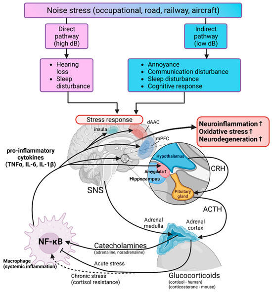 Mechanisms of noise-induced neuroinflammation and oxidative stress. Noise can cause neuroinflammation and oxidative stress through two pathways: direct and indirect. In the direct pathway, noise causes inner ear damage, hearing loss, and sleep deprivation, while in the indirect pathway, it creates a state of annoyance and disturbs sleep and communication. Both of these pathways activate the stress response through the activation of the hypothalamic–pituitary–adrenal (HPA) axis and the activation of the sympathetic nervous system (SNS). The activation of the HPA axis results in the release of CRH (corticotropin-releasing hormone) and ACTH (adrenocorticotropic hormone), further promoting the release of glucocorticoids from the adrenal cortex. The activation of the SNS results in secretion of catecholamines from the adrenal medulla. Both the HPA axis and the SNS activation result in systemic inflammation signaling through macrophage activation and cytokine release (such as tumor necrosis factor-alpha—TNFα; and interleukin 6/1β—IL-6/1β), further activating neuroinflammation and oxidative stress. Abbreviations: NF-κB (nuclear factor kappa-light-chain-enhancer of activated B cells), dAAC (dorsal anterior cingulate cortex), mPFC (medial prefrontal cortex). Adapted from [218]. Created with BioRender.com.