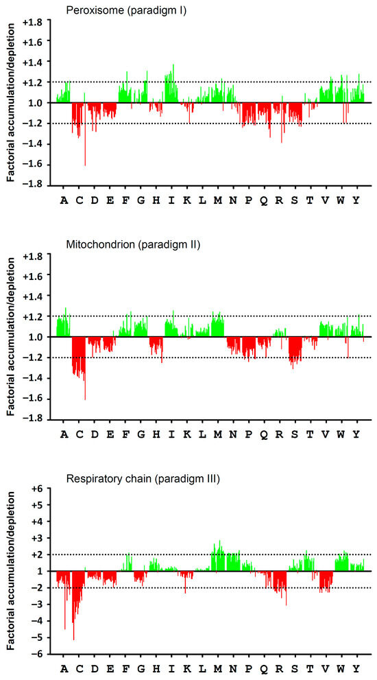A graphical representation of the quantitative data of Table 2 is provided in Figure 1. Therein, fractional increases or decreases are plotted for each amino acid as a bar stack, in which each bar (as red or green line) represents 1 (out of 20) animal species. The 20 animal species were sorted by decreasing lifespan from left to right analogously, as listed in Table 1. Several aspects in this comparison across paradigms and amino acids are noteworthy. First, amino acid usage changes in mitochondrially encoded proteins (versus all mitochondrial proteins, paradigm III) were generally more pronounced, often reaching a factorial accumulation/depletion by a factor of 2 (or ½). In the other paradigms, the approximate equivalence was a factorial accumulation/depletion by a factor of 1.2 (or 1/1.2). Still, interspecies variation (i.e., the variability within each bar stack) was largely unrelated to the degree of accumulation/depletion, but it appeared to be somewhat higher in peroxisomes, which is likely attributable to the smaller number of proteins in several representatives of this groups (Table 1). The most interesting outcome of the vertical comparison of the three plotted paradigms is yet their similarity, particularly as regards the prototypically redox-active amino acids cysteine, methionine, tyrosine and tryptophan: cysteine was strongly decreased (red color in Figure 1), whereas methionine, tyrosine and tryptophan were increased throughout (green color in Figure 1). As further discussed below, this behavior matches well with the inferred functional consequences of amino acid (one-electron) oxidation in (membrane) proteins as derived from chemical reaction rate constants [12].
