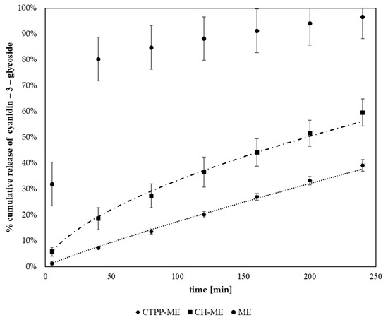Profile release cyanidin-3-glycoside of maqui extract (ME), chitosan (CS), maqui extract nanoencapsulated in CTPP (CTPP−ME), chenopodin (CH), and chenopodin maqui extract (CH−ME).