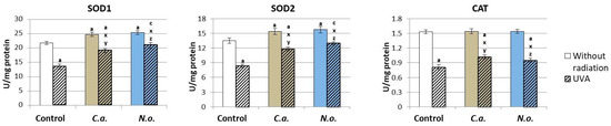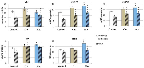 3.1. The Influence of Lipid Extracts from the Microalgae Chlorococcum amblystomatis and Nannochloropsis oceanica on Redox Balance Disturbance Caused by UVA Irradiation of Fibroblasts