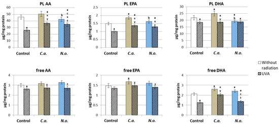- Biernacki, M.; Conde, T.; Stasiewicz, A.; Surażyński, A.; Domingues, M.R.; Domingues, P.; Skrzydlewska, E. Restorative Effect of Microalgae Nannochloropsis oceanica Lipid Extract on Phospholipid Metabolism in Keratinocytes Exposed to UVB Radiation. Int. J. Mol. Sci. 2023, 24, 14323. [Google Scholar] [CrossRef] [PubMed]
