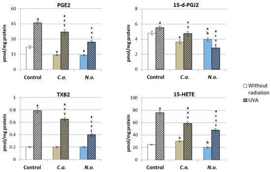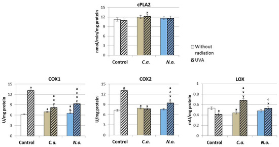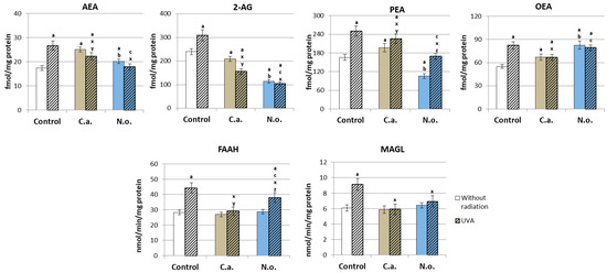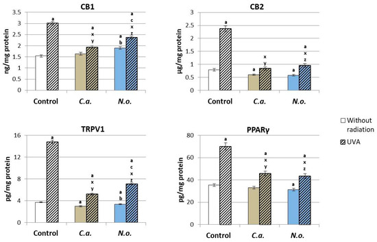 - Gęgotek, A.; Jastrząb, A.; Dobrzyńska, M.; Biernacki, M.; Skrzydlewska, E. Exogenous Antioxidants Impact on UV-Induced Changes in Membrane Phospholipids and the Effectiveness of the Endocannabinoid System in Human Skin Cells. Antioxidants 2021, 10, 1260. [Google Scholar] [CrossRef]