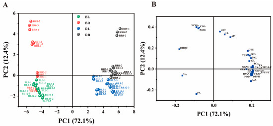 (A) Scatter plot of chive samples and (B) component loading plot of 32 parameters (including phenolic compounds, ascorbic acid, related enzymes and antioxidant parameters) obtained through principal component analysis. RL, round green part (RG) stored at 4 °C. BL, bottom white part (BW) stored at 4 °C; RR, RG stored at 20 °C. BR, BW stored at 20 °C. PA, phenylalanine; TCA, trans-cinnamic acid; PCA, p-coumaric acid; CA, caffeic acid; FA, ferulic acid; SA, sinapic acid; HBA, p-hydroxybenzoic acid; VA, vanillic acid; GA, gallic acid; QC, quercetin; IH, isorhamnetin; DHQC, dihydroquercetin; HPT, hesperitin; NCGA, neochlorogenic acid; CGA, chlorogenic acid; RUT, rutin; API, apigenin; LL, luteolin; NGNC, naringenin chalcone; TPC-FC, total phenolic content measured using the Folin–Ciocalteu method; TPC-LC, sum of phenolic compounds measured via LC–MS; AsA, ascorbic acid.