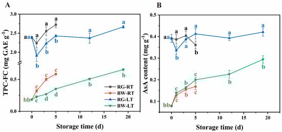 Contents of (A) TPC-FC and (B) ascorbic acid in different parts of chives during storage at 20 °C (RT) and 4 °C (LT). RG, round green part. BW, bottom white part. Data are presented as the means of three independent measurements. The letters represent differences among different tissues under RT and LT at each time point.