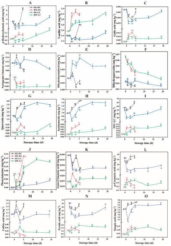 Phenolic compound profiles in different parts of chive stored at 20 °C (RT) and 4 °C (LT). RG, round green part. (A) p-hydroxybenzoic acid, (B) vanillic acid, (C) gallic acid, (D) naringenin chalcone, (E) dihydrokaempferol, (F) dihydroquercetin, (G) quercetin, (H) isorhamnetin, (I) TPC-LC, (J) phenylalanine, (K) trans-cinnamic acid, (L) p-coumaric acid, (M) caffeic acid, (N) ferulic acid, (O) sinapic acid. BW, bottom white part. Data are presented as the means of three independent measurements. The letters represent differences among different tissues under RT and LT at each time point.