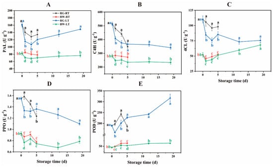 Activities of the enzymes involved in the biosynthesis and degradation of phenolic compounds in different parts of chive stored at 20 °C (RT) and 4 °C (LT). (A) PAL, (B) C4H, (C) 4CL, (D) PPO, (E) POD. PAL, phenylalanine ammonia–lyase; C4H, cinnamate 4-hydroxylase; 4CL, 4-coumaroyl-CoA ligase; POD, peroxidase; PPO, polyphenol oxidase. RG, the round green part. BW, the bottom white part. Data are the means of the three independent measurements. Letters represent differences among different tissues under RT and LT at each time point.