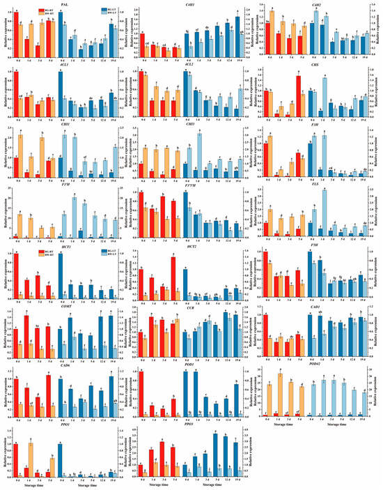 As shown in Figure 5, the relative expression of PAL in RG under both RT and LT initially declined and then increased during the late storage stage. Conversely, PAL in BW remained constant under RT but declined initially and then increased under LT. PAL generally maintained a higher level of expression in BW than in RG during storage, with a 0.82- and 1.89-fold increase in expression levels on days 1 and 3 under RT and 0.23- to 0.70-fold higher expression from days 1–12 under LT. LT inhibited PAL expression during storage. C4H1 in chives showed different trends under RT and LT, decreasing under RT but increasing under LT. Its expression was higher in RG compared with BW under LT, showing a 0.26- to 0.76-fold increase. Conversely, C4H2 showed a declining trend, with elevated expression in BW than in RG, with a 0.54- to 0.90-fold increase under RT and a 0.15- to 0.80-fold increase under LT. LT inhibited C4H2 expression on days 3 and 5 compared with RT. Both 4CL1 and 4CL2 showed decreasing trends during storage. BW showed a higher expression level in 4CL2 than RG, with a 0.56- to 0.88-fold increase under RT and a 1.85- to 3.57-fold increase from days 5 to 19 under LT. Notably, LT inhibited the expression of 4CL1 and 4CL2.
