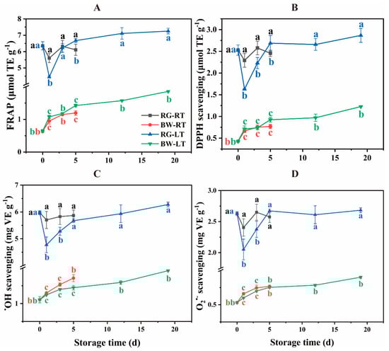 (A) FRAP activity, (B) DPPH scavenging, (C) •OH scavenging and (D) O2•− scavenging in different parts of chive stored at 20 °C (RT) and 4 °C (LT). RG, round green part. BW, bottom white part. TE, Trolox equivalents. VE, AsA equivalents. Data are presented as the means of three independent measurements. The letters represent statistical differences among different tissues under RT and LT at each time point.