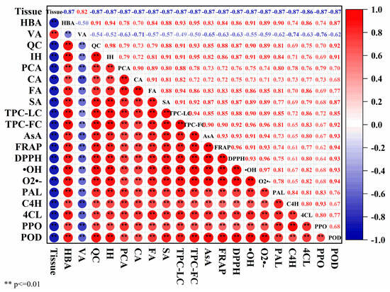 The correlation analysis is presented in Figure 7. Tissue type showed a high relationship with each parameter (|r| > 0.8 **, p < 0.01), indicating a correlation between parameters and tissue types. VA displayed a negative correlation with other phenolic compounds. Antioxidant activity parameters strongly correlated with HBA, QC, IH, FA, SA, TPC-LC, TPC-FC and AsA (r > 0.8 **, p < 0.01). This was in alignment with reports that showed increased TPC and AsA content in onions treated with licorice root extract and Trichoderma album, thereby enhancing antioxidant activity [37,38] and the highest phenolics coinciding with the highest DPPH scavenging and FRAP in stems compared with bulbs and flowers in Allium pallens L. [39]. Enzymes involved in the biosynthesis and degradation of phenolic compounds exhibited a positive correlation with each phenolic compound, TPC-LC and TPC-FC (r > 0.65 **, p < 0.01), except for a negative correlation with VA.
