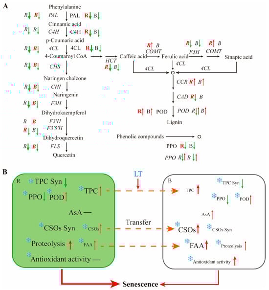 (A) Comparison of gene expression and enzyme activities in the phenylpropanoid pathway in different parts of post-harvest chive; and (B) mechanism of biosynthesis, change and transfer of different nutrients in different parts of chive during storage. R, round green part; B, bottom white part. CSOs, S-alk(en)ylcysteine sulfoxides; FAAs, free amino acids; Syn, synthesis. R and B in italics represent the expression of related genes in the corresponding part. R and B without italics represent the activity of related enzymes in the corresponding part. R and B in red denote that the tissue has higher gene expression level or enzyme activity than that observed in other tissues. ↑ means increase. ↓ means decrease.