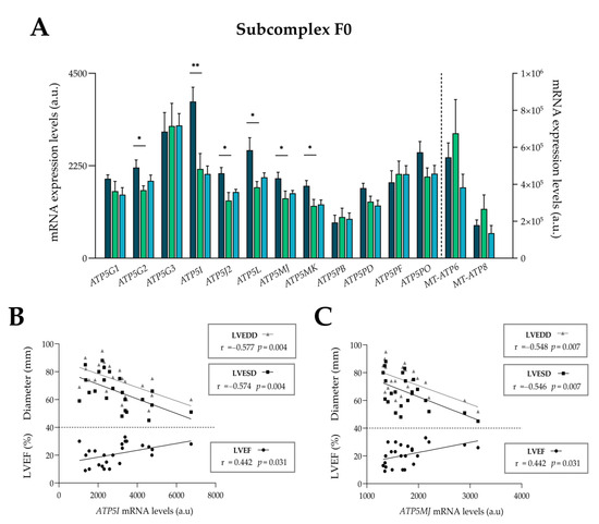 Specifically, in complex V, the subunits of the F0 portion ATP5G2, ATP5I, ATP5J2, ATP5L, ATP5MJ, and ATP5MK, and the subunits of the F1 portion, ATP5D and ATP5IF1, were overexpressed. This general upregulation may be due to the need to generate a greater amount of ATP to match the rate of ATP consumption on a beat-to-beat basis [10,29]. In that sense, the overexpression of ATP5I, ATP5MJ, and ATP5IF1 was significantly correlated with better cardiac function (LVEF) and measurements related with remodeling cardiac parameters (LVESD and LVEDD). We have previously observed that the protein overexpression of the alpha subunit of ATP synthase (ATP5A) correlated with a decrease in left ventricle mass, showing that the activity of ATP synthase is key in cardioprotection [50]. Here, the overexpression of ATP5IF1 at mRNA and protein level can be evidence for the prevention of ATP consumption during collapse of the electrochemical gradient, because ATP5IF1 is an inhibitor of the ATP hydrolase function. On the other hand, in ATP5I, despite being altered at the gene expression level, no protein alteration is observed. The overexpression of has-miR-483-3p, a negative regulator of ATP5I [51], could explain the absence of dysregulation at the protein level. ATP5I has been described as a partaker in the direct oxidative stress, DNA damage, responsible for ROS generation [52]. This post-transcriptional regulatory process in ATP5I expression may suggest the existence of a compensatory mechanism to maintain reduced ROS [10].