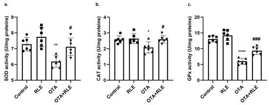 (a) Liver SOD activity; (b) liver CAT activity; (c) liver GPx activity. Control group (control); RLE group (RLE); ochratoxin A group (OTA); RLE plus OTA (RLE + OTA). Data are expressed as mean ± standard deviation (SD) of n = 6 rats (* p < 0.05, ** p < 0.01, **** p<0.0001 vs. control; # p < 0.05, ### p < 0.001 vs. OTA).