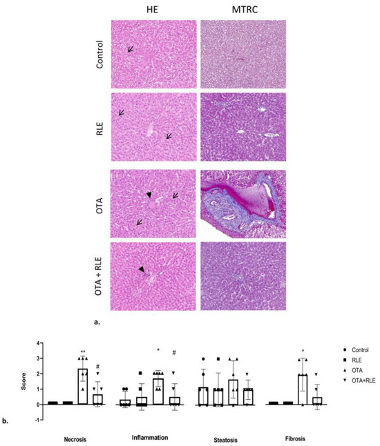 Rats’ liver with hematoxylin and eosin (HE) and Masson’s trichrome (MTRC) stains, 40× magnification, scale bar = 0.020 mm. Control group (control); red orange and lemon extract group (RLE); ochratoxin A group (OTA); ochratoxin A plus red orange and lemon extract group (OTA + RLE). (a) Rats in the control and RLE groups showed numerous disseminated swollen hepatocytes with intracytoplasmic optically empty vacuoles (steatosis, arrow) with HE staining, and a normal amount of interstitial connective tissue (blue) with MTRC staining. OTA-treated rats showed periportal infiltration of lymphocytes (arrowhead) and numerous disseminated swollen hepatocytes with intracytoplasmic optically empty vacuoles (steatosis, arrow). Rats in the OTA group also showed portal spaces severely expanded by abundant fibrous connective tissue (blue) with MTRC staining. Rats in the OTA + RLE group showed focal periportal infiltration of lymphocytes (arrowheads) and numerous disseminated swollen hepatocytes with intracytoplasmic optically empty vacuoles (steatosis, arrow) with HE staining. Rats in the OTA + RLE group showed portal spaces moderately expanded by fibrous connective tissue (blue) with MTRC staining. (b) Severity scores for inflammation, steatosis, necrosis, and fibrosis for each group. Asterisks represent statistically significant differences between groups (* p < 0.05, ** p < 0.01 vs control; # p < 0.05 vs OTA).