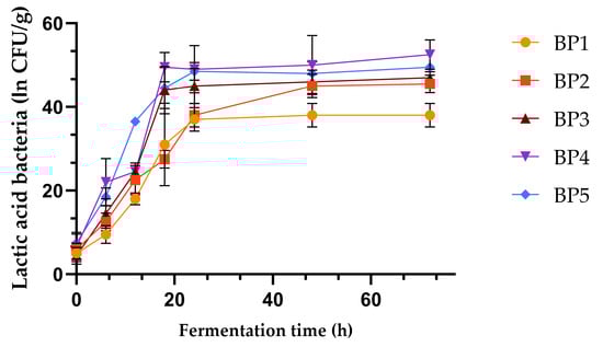 The pH values of the BP samples were slightly acidic, ensuring an environment conducive to beneficial microbial activity while inhibiting harmful bacteria. Acidity, often measured as titratable acidity, reflects the concentration of organic acids produced, influencing flavor and preservation. During fermentation, the pH of all of the samples decreased as the lactic acid bacteria produced acids, while the acidity increased. Figure 1 shows the dynamics of bacterial growth during the 72 h of fermentation in BP samples, where the exponential growth phase can be observed. After 20 h, the bacterial growth entered the stationary phase.