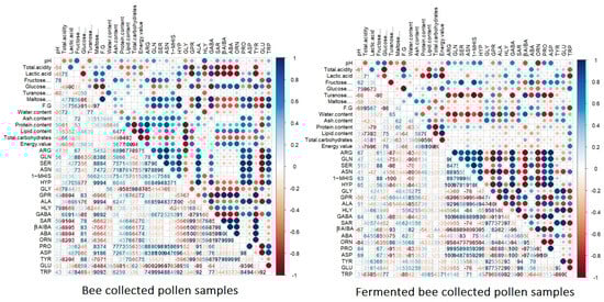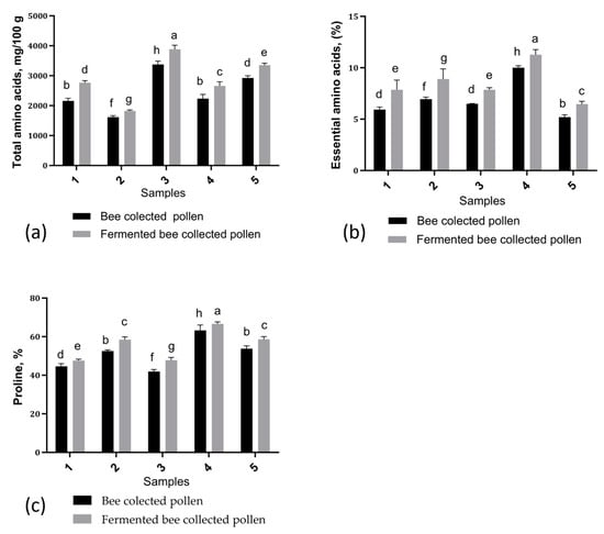 The highest value for total amino acids was identified in sample BP3 (3406.37 mg/100 g), and the lowest in sample BP2 (1598.19 mg/100 g). The values in the case of fermented BP were between 1696.83 and 3429.85 mg/100 g. The total amino acid contents of the BP samples varied depending on the floral origin. The nine essential amino acids (i.e., threonine, methionine, lysine, histidine, valine, tryptophan, leucine, phenylalanine, and isoleucine) were identified in the analyzed samples. Among all of the 28 amino acids identified, proline was identified in the largest amounts. In all analyzed samples, after fermentation, an increase in the value of total amino acids was observed.