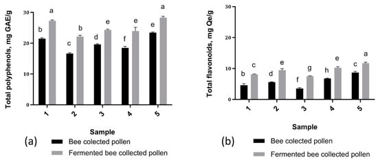 Polyphenols and flavonoids represent significant groups of substances with different bioactive properties, and in the present work their total contents were quantified by spectrophotometric methods. Their variation in unfermented and fermented BP samples can be seen in Figure 3.