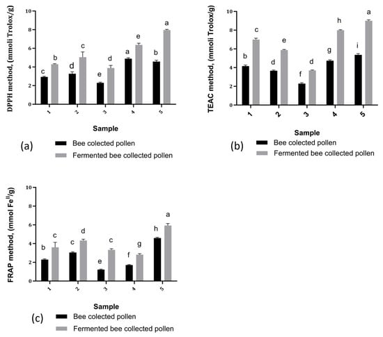 Amino acid profile of the samples analyzed before and after fermentation: (a) Total amino acid contents from BP samples before and after fermentation. (b) Contents of essential amino acids from BP samples before and after fermentation. (c) Proline content of BP samples before and after fermentation. BP = bee-collected pollen, FBP = fermented bee-collected pollen. Vertical error bars correspond to standard deviations (n = 3). Different letters represent significant differences (p < 0.05).