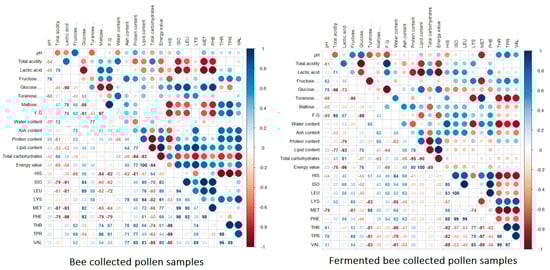 The results show that the amount of water in the BP samples before and after fermentation was similar, with no significant differences being recorded. The water content of the raw samples obtained directly from the beekeepers was influenced to a greater extent by the climatic conditions from the moment of harvesting.