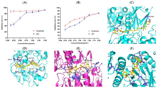 Inhibition rate and binding capacity of GC on α-glucosidase and α-amylase. The impact of GC on the inhibition rate of α-glycosidase (A) and α-amylase (B). Molecular docking of GC to α-glycosidases (C) and α-amylase (D). Molecular docking of acarbose to α-glycosidases (E) and α-amylase (F).