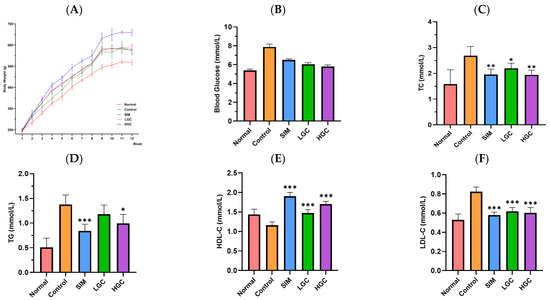 As shown in Figure 3A, with the increase in feeding duration, there was a gradual increase in weight for each group; however, the weight values of the Normal, SIM, LGC, and HGC groups remained consistently lower than that of the Control group. After the 9th week, the body weight of LGC exhibited a consistent trend, while the body weight of the HGC group demonstrated a declining pattern. The impact of GC on rat body weight control was comparable to that of the SIM group and approached that observed in the Normal group. The findings suggest that GC exerts effective control over the body weight of rats.