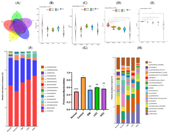We employed 16s rDNA gene sequencing technology to assess the impact of GC on the diversity and composition of gut microbiota. In Figure 5A, according to the abundance of the obtained eigenvalues, the number of common features in each group is calculated, and the number of common and unique features in each group is visually presented by Venn diagram. The five comparison groups collectively exhibited a total of 183 identical features, with the Normal group demonstrating significantly higher prevalence compared to the other groups. Compared to the Control group, the difference of feature in the Normal group, SIM group, LGC group, and HGC group was 79.58%, 74.92%, 81.18%, and 79.05%, respectively, indicating that the gut microbiota abundance was different in each group.