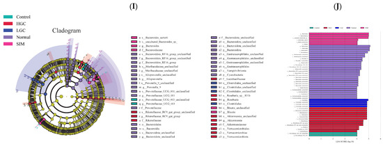 LEfSe (Linear discriminant analysis Effect Size) analysis was used to find the Species Biomarker with a significant difference in abundance between groups. From the LEfSe analysis results, we found that the main contributors (LDA score > 4.0) differed between the different groups, as shown in Figure 5I,J. HFD-induced communities were dominated by Prevotellaceae. The LGC and HGC communities were dominated by Akkermansia, Rikenellaceae_RC9_gut_group, Lactobacillaceae, and Clostridiales. The community of the HGC group was dominated by three OTUs of Akkermansia. The HGC group demonstrated a significantly higher proportion of Akkermansia, which is worth noting.