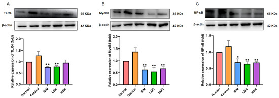 The intestinal barrier dysfunction is ameliorated by GC via the TLR4/Myd88/NF-κB signaling pathway. The protein expression levels of (A) TLR4, (B) Myd88, and (C) NF-κB were determined by Western Blot. SIM, LGC, HGC vs. Control, * p < 0.05, ** p < 0.01.