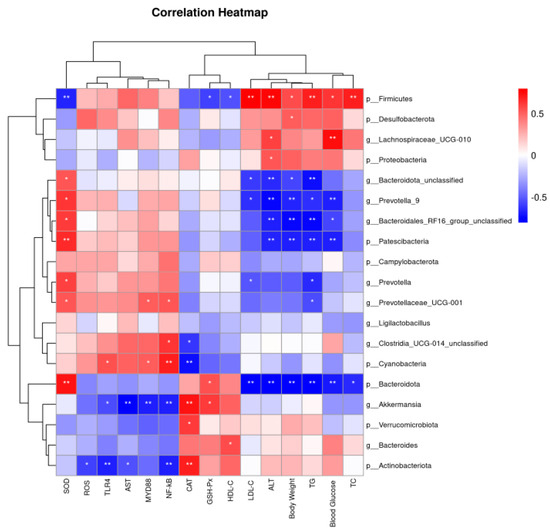 Heatmap of correlation analysis between representative gut microbiota and biochemical parameters. * p < 0.05, ** p < 0.01.