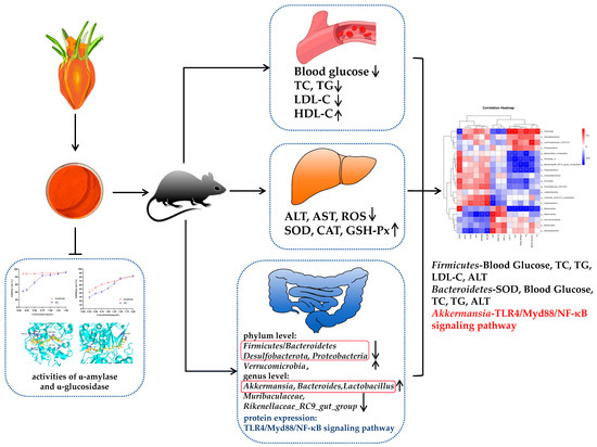 Glycolipid metabolism disorder, as a crucial characteristic of metabolic diseases, poses a significant threat to human health. Glycolipid metabolism disorder is characterized by dysregulation in glucose and lipid metabolism, accompanied by insulin resistance, oxidative stress, inflammatory response, and an imbalance in intestinal flora as the core pathological mechanisms [1,2,3]. This condition manifests clinically as hyperglycemia, dyslipidemia, non-alcoholic fatty liver disease, obesity, hypertension, and atherosclerosis, either individually or in combination. Therefore, a comprehensive understanding and integrated approach to prevention and control are imperative. In the context of glucose and lipid metabolic disorders, insulin resistance (IR) can perpetuate itself through a negative feedback loop, leading to hyperinsulinemia and hyperglycemia [4]. Within the state of IR, the inhibitory effect of insulin on lipolysis is significantly attenuated, resulting in the substantial release of Free Fatty Acids (FFAs) into systemic circulation [5]. The elevation of FFAs induces an upregulation in the synthesis and secretion of triglycerides (TG) within the liver, consequently leading to an increase in low-density lipoprotein cholesterol (LDL-C) levels and a reduction in high-density lipoprotein cholesterol (HDL-C) levels, ultimately resulting in hypertriglyceridemia. Simultaneously, elevated levels of FFAs induce lipotoxicity, resulting in impaired glucose uptake in peripheral tissues and subsequent IR [6]. These interconnected mechanisms establish a positive feedback loop that accelerates the onset and progression of metabolic disorders related to glycolipid metabolism. The oxidative stress caused by the imbalance of REDOX reaction causes reactive oxygen species (ROS) to increase dramatically in the body, which eventually leads to the occurrence of obesity, diabetes, and other chronic diseases dominated by metabolic syndrome [7]. In addition, more and more experimental studies have proved that intestinal barrier and intestinal flora can directly or indirectly affect oxidative stress, inflammation, and insulin resistance, and then affect glycolipid metabolism disorder [8].