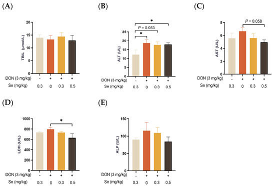 As displayed in Figure 2, the serum TBIL concentration and ALP activity of the piglets were not affected by dietary treatments (p > 0.05). In comparison to the 0.3 mg/kg Se without DON treatment group, the ALT activity in the serum of the piglets was observed to be elevated in the DON groups, regardless of the supplemental Se levels (p < 0.05 or p = 0.053). In the presence of DON exposure, the serum enzymatic activities of AST (p = 0.058) and LDH (p < 0.05) were decreased when the piglets were administered 0.5 mg/kg Se in place of 0 mg/kg Se.